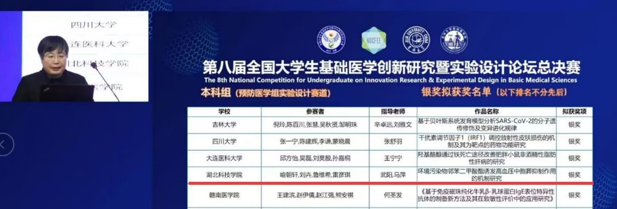 (通讯员 武阳)2023年1月14-15日,第八届全国老员工基础医学创新研究暨实验设计论坛全国总决赛在吉林大学举行。db真人体育官网临床医学本科2020级卓越班喻朝轩、刘卉、鲁维希、雷彦琪团队获预防医学组实验设计赛道银奖,该团队指导教师为db真人体育官网武阳博士和马萍教授,获得本届国赛银奖实现了公司在该赛事上的突破。此次总决赛由高等公司国家级实验教学示范中心联席会基础医学组主办,采取线上线下相结合的方式进行,来自全国30余个省份,140余所高校,430支参赛团队,共计2500余名师生参加,网络视频直播平台累计参与观摩互动师生总人数达30余万人次。