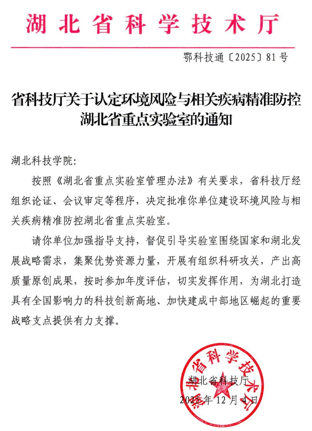 “环境风险与相关疾病精准防控湖北省重点实验室”立项建设
