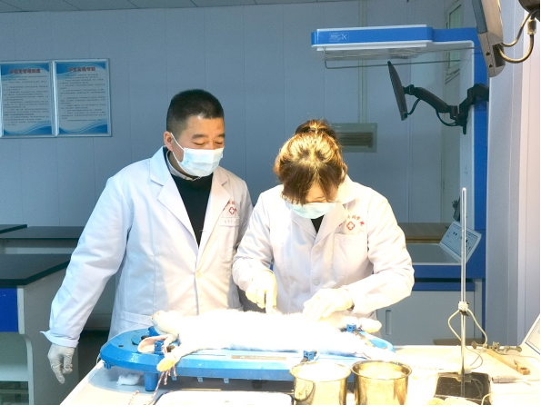 生理学实验教学除了需要具备丰富的理论知识,还需要掌握熟练的动物实验操作技能。为了更好地让新进教师快速地融入教学团队,掌握规范的实验操作步骤,生理学教研室王柏军老师对刘玲进行了动物麻醉固定、气管插管、动脉插管以及膀胱插管等方面的实验技能培训。在培训过程中,王柏军进行了认真细致的解说和操作演示。