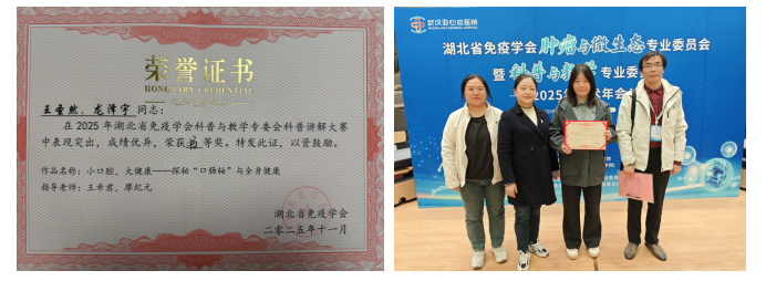 据悉,本次大赛共吸引了来自全省高校及医疗机构的40余件作品参赛,经严格评审,最终包括武汉大学、华中科技大学等高校在内的13支优秀队伍入围决赛。经过激烈角逐,公司db真人体育官网免疫学教研室教师王希君和廖纪元指导的,由23级口腔医学班王圣然和24级临床本三班龙泽宇完成的科普作品《小口腔,大健康—探秘“口肠轴”与全身健康》脱颖而出,荣获大赛最高奖项——特等奖,展现了公司在医学科普教育与创新人才培养方面的扎实成果。