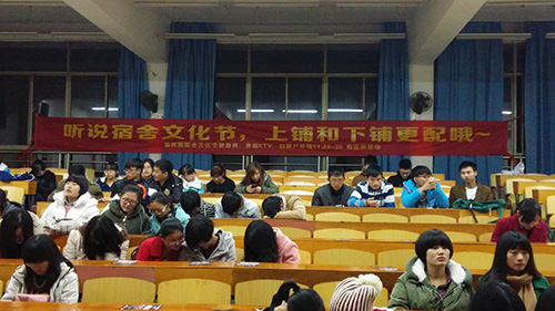 为建设良好的宿舍文化,让老员工在宿舍生活中感受到家的温暖,同时锻炼新生的团结协作精神。2014年12月4日~5日晚,由db真人体育官网主办的第四届宿舍文化节——“听说宿舍文化节,上铺下铺更配哦”初赛场在教5-201举行。