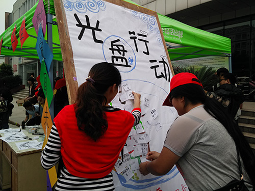 在食堂门口的志愿签名处,路过的同学在志愿者的帮助下在白色的便利贴上写下自己的名字粘贴在活动的海报上,以表明自己作为光盘行动者的决心。不一会儿,海报上画着的大盘子里的触目惊心剩饭剩菜就被同学们的签名便签覆盖了。旁边进行垃圾分类游戏的地方更是人潮涌动,大家纷纷排队,跃跃欲试。在这个简单轻松的小游戏里,同学们不仅学会了一些日常生活中的垃圾分类知识,而且懂得了垃圾分类的重要性。