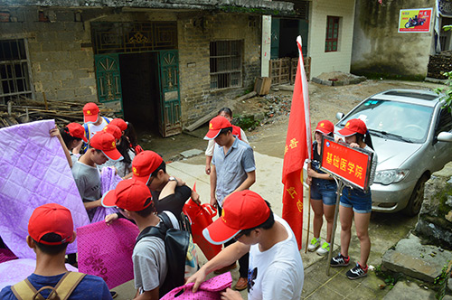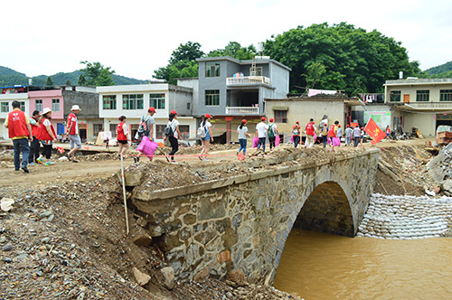 16日上午7:00,校志愿者与义工协会志愿者、基础院师生代表前往严重灾区崇阳县石城镇石门村。山路曲折,沿途随处可见“小心山体滑坡”之类的警示牌。伴随着咳咳的摩擦声,一路颠簸的赈灾团队终于抵达。冲毁的桥梁,倒塌的房屋,这里的一切都显得那么残破不堪。在村长的带领下,志愿者们迅速地将物资发放到灾民手中,并将剩余物资妥善搬运到临时安置点。下午2:00点,在村民们感激和道别声中,赈灾团队欣慰地踏上了归途。