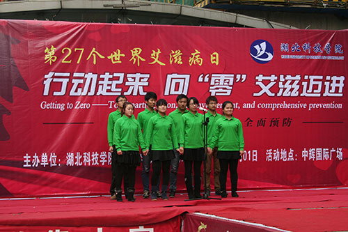 活动尾声,八名身着绿色制服的志愿者手拉手,一同歌唱《飘扬的红丝带》,给整个冬日增添一份温暖。最后,志愿者们与市民们一同上台签名,坚定抗击艾滋病的决心。