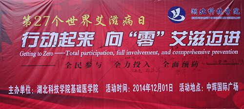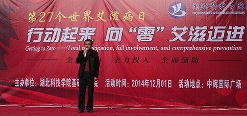 预防艾滋,从我做起。2014年12月1日,在第27个世界“艾滋病日”来临之际,由db真人体育官网主办的“行动起来,向‘零’艾滋迈进”主题活动在温泉中辉国际广场举行。咸宁市卫生计生委副主任梁春阳、咸宁市疾病控制中心主任陆剑波、卫生委疾控科科长黄飞雄、db真人体育官网党总支书记范杉等领导嘉宾出席本次活动。