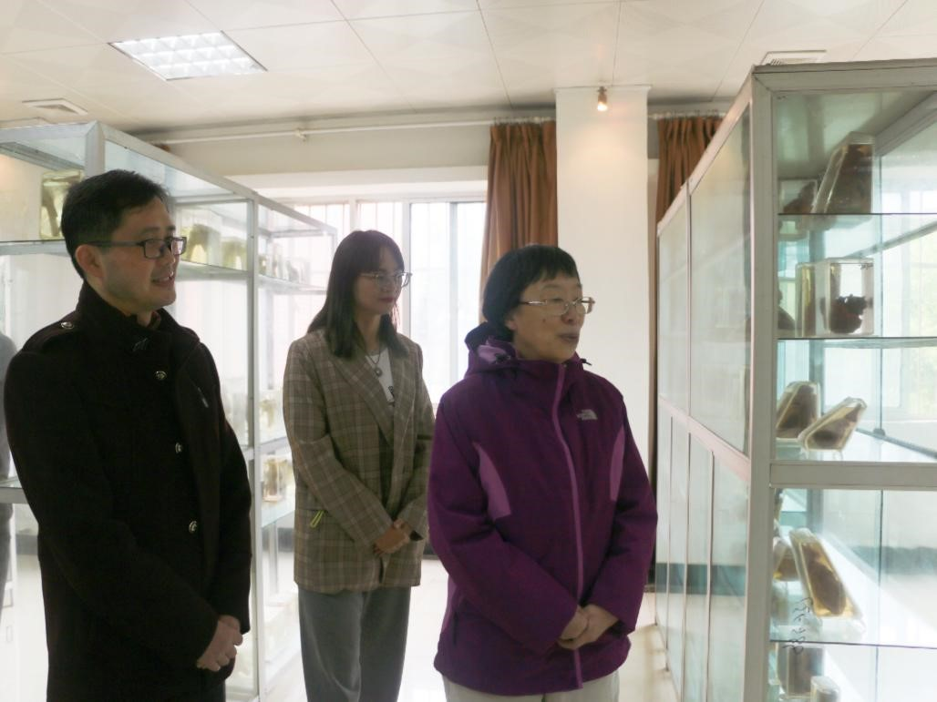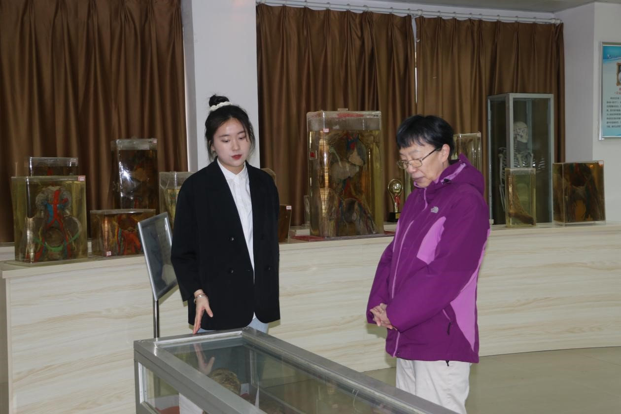 在参观过程中,王新知教授对琳琅满目的标本给予了高度的肯定,连连赞叹标本制作之精美、种类之丰富,同时这些标本也让王教授回忆起她曾经的老员工活。那时候学习条件十分艰苦,标本数量有限,同学们经常围着骷髅架(人体骨骼标本)一边吃饭一边讨论学习问题。甚至有时候同学们还会把标本“偷”回宿舍反复学习,导致老师们每次要趁他们上课的时候去宿舍把这些标本“偷偷带”回来。