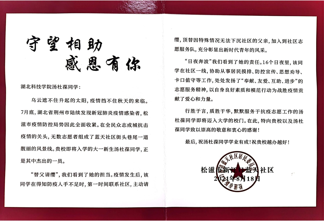 汤杜葆是医学部预防医学21级新生,在高考结束的这个暑假,本应在家享受难得的假期,憧憬大学的美好生活,但疫情的多点暴发打乱了她平静的生活。731日,《关于下沉党员干部参与疫情防控相关工作的通知》被不断转发,森林公馆下沉党员汤波第一时间到蓝天社区报到。但因为在特殊岗位而无法下沉参加小区疫情防控工作。当时作为准老员工的汤杜葆,在知道这个情况后,决定接替父亲参加蓝天社区的疫情防控工作。