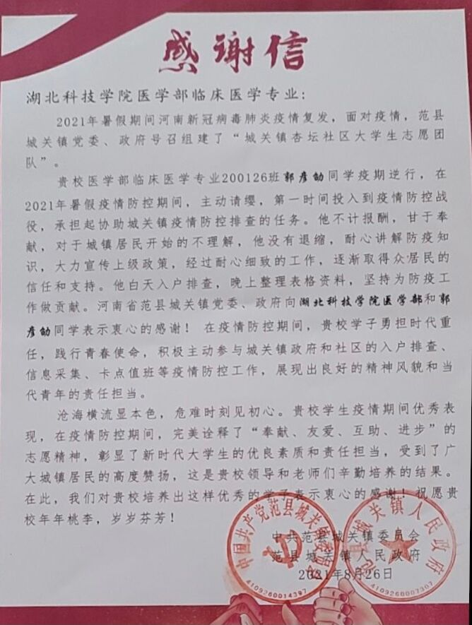 (通讯员:林宁)近日,两封感谢信先后送抵公司。这两封感谢信分别来自河南省范县城关镇党委、政府和松滋市新江口蓝天社区居委会,为公司医学部临床医学20级医员工和预防医学21级医员工,在暑假期间主动支援当地疫情防控工作点赞。