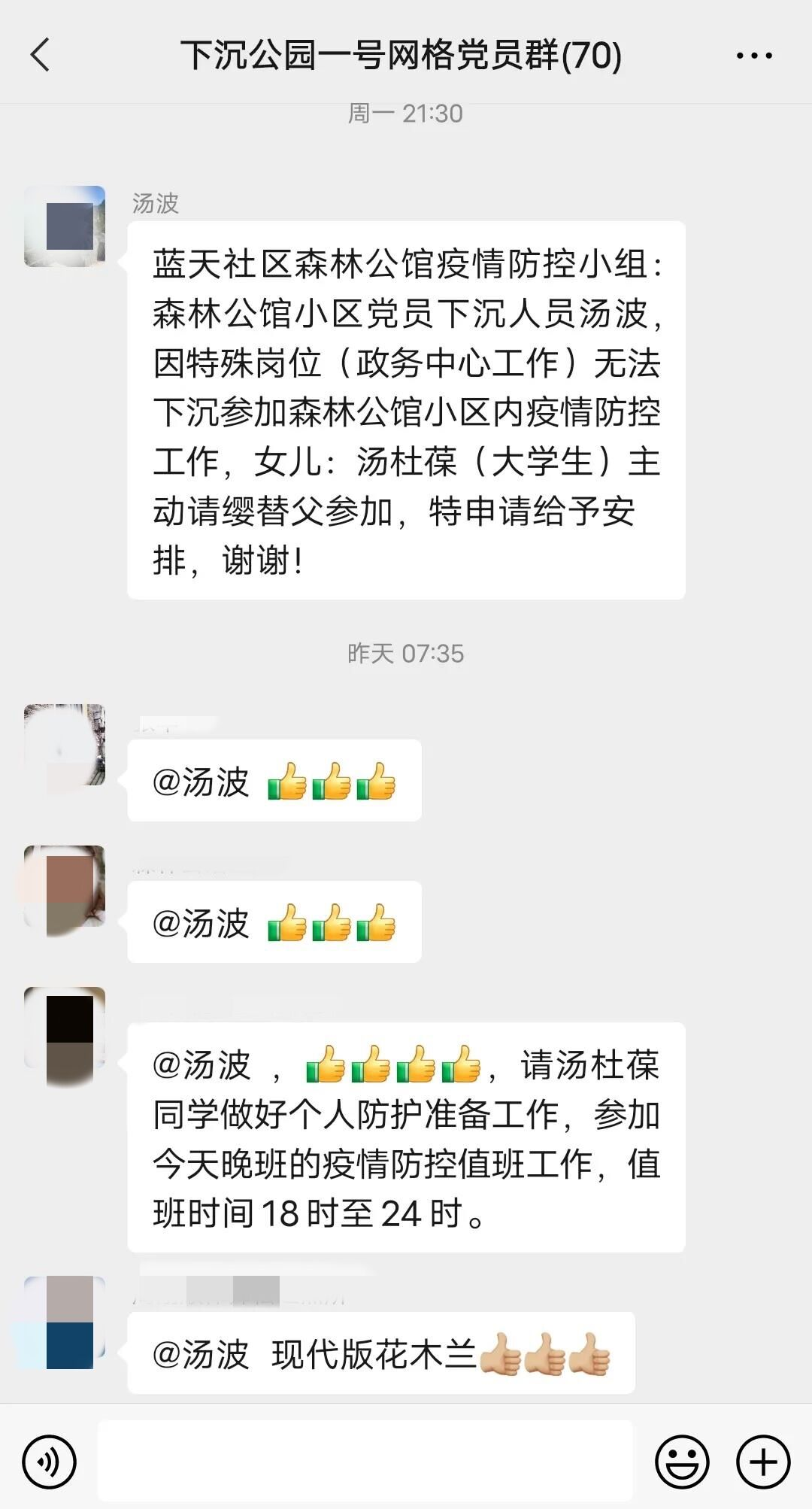 “蓝天社区森林公馆疫情防控小组:森林公馆小区党员下沉人员汤波,因特殊岗位无法下沉参加森林公馆小区疫情防控工作。女儿汤杜葆主动请缨替父亲参加,特申请给予安排,谢谢!”在公园一号网格下沉党员群里,这样一则消息引发群内党员点赞。