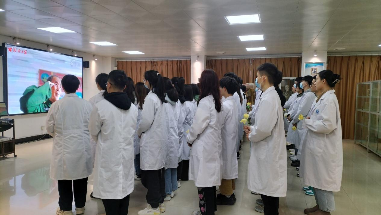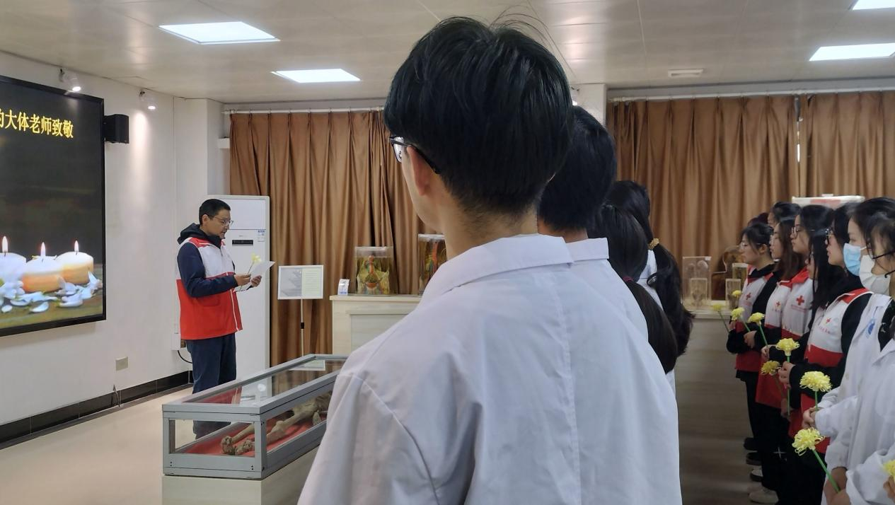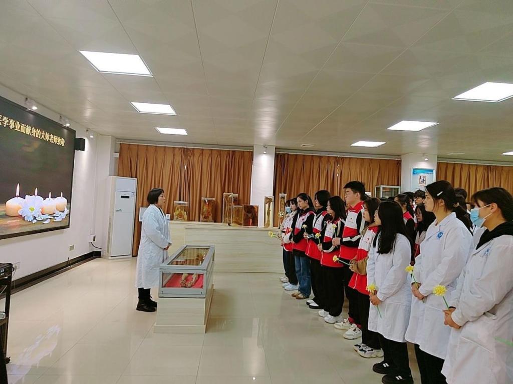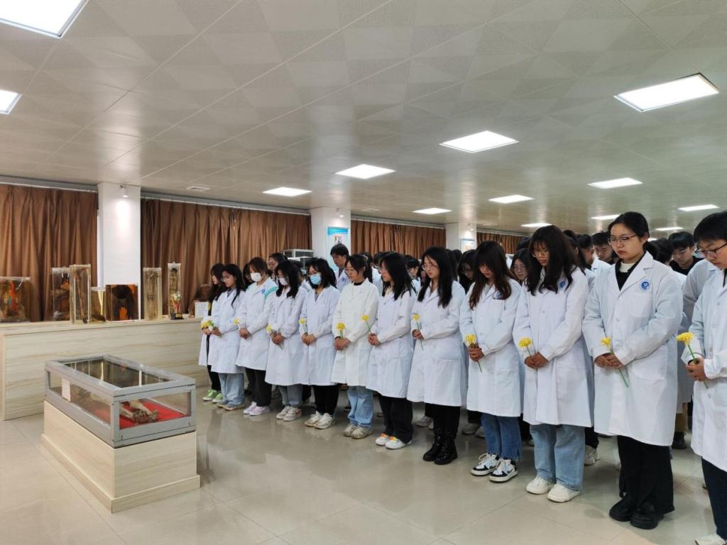 讲解员们介绍完毕,全体师生鞠躬90度,向医学先驱、遗体器官捐献者和大体老师们表达感谢,并将亲手制作的菊花献给他们,寄去一份追思、一份尊敬、一份感恩。员工代表刘鲁迪发言,表示通过这次清明活动更加理解了生命的意义,自己一定会努力学习,用医学知识武装自己,治病救人,以此慰藉那些曾经为医学事业奉献终身的前辈。教师代表张涛老师告诫同学们,清明祭祀是对自己已故亲人对一种原始的、朴素的爱,是小爱;我们更应该学习先贤们和那些器官捐献者毫无保留的奉献精神,这才是一种大爱。