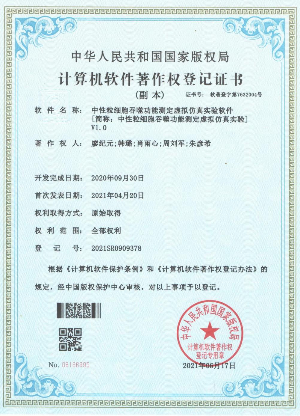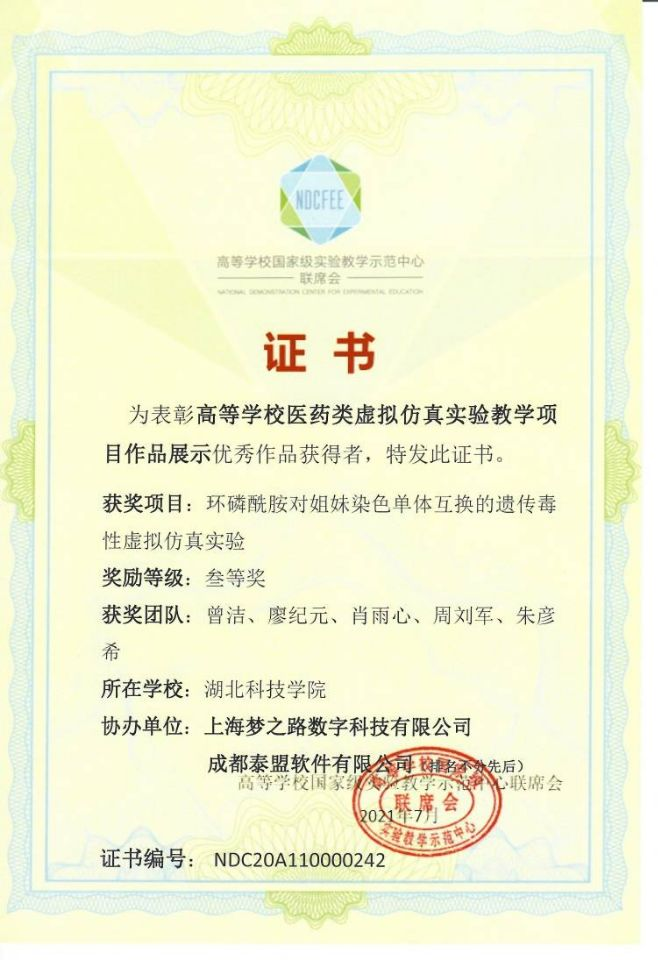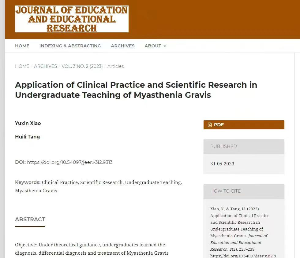 扎实的成绩是科研的基础。2021年3月,她加入医学虚拟仿真实验团队,同年6月作为代表进行汇报,相关项目斩获高等联席会颁布的国家级三等奖两项、计算机软著专利一项;2022年3月,加入校内青砖茶科研团队,参与动物实验、氟离子测定等相关工作,项目最终获得DB视讯互联网+校赛金奖,省赛铜奖;2023年1月,在跟随临床带教老师见习的同时,负责相关病案的收集整理和文章书写工作,在Journalofeducationandeducationalresearch上发表一篇神经内科方向论文。