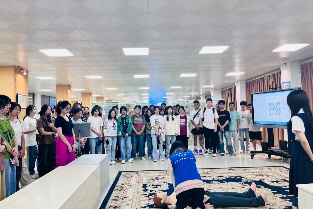 在CPR演示区,讲解员与志愿者们向同学们完整演示心肺复苏的急救过程