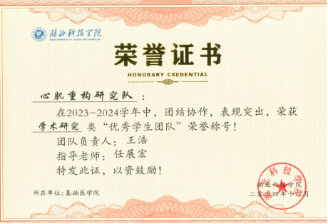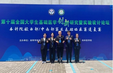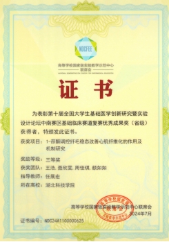 在2024年7月的“第十届全国老员工基础医学创新研究暨实验设计论坛”中南部赛区赛事上,在任展宏副教授指导和带领下,心肌重构研究队成员王浩(队长)、聂欣雯、周佳琪(主讲人)和颜如如同学以“1-茚酮调控纤毛稳态改善心肌纤维化的作用及机制研究”项目斩获省级三等奖。