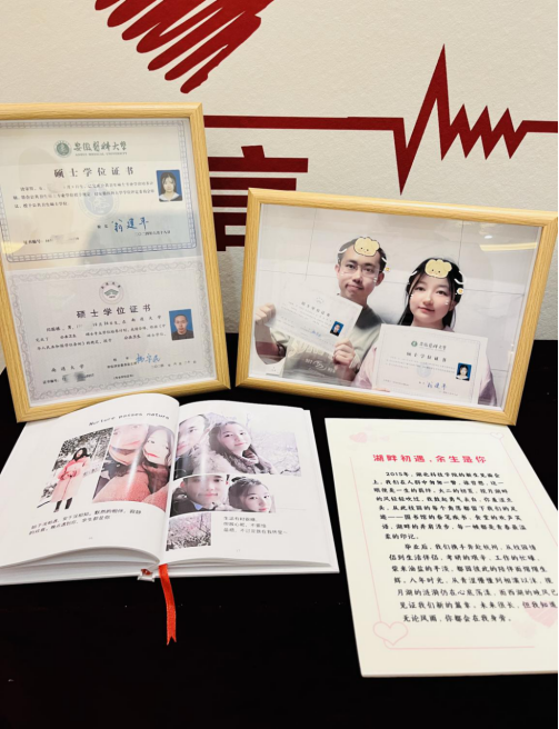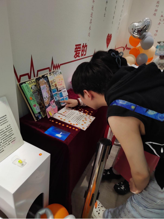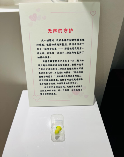 步入爱情博物馆,一件件承载深情的信物静静陈列,每一件背后都藏着一段动人故事。其中,一对毕业生捐赠的爱情信物吸引了众人目光。他们从DB视讯本科毕业,携手考上研究生,再到并肩工作,以共同的理想为帆,相互扶持前行。这份双向奔赴的爱情,成为爱情中最好的典范,恰似暗夜中的灯塔,照亮同学们对美好爱情的向往。还有那肚皮圆滚滚的鲨鱼抱枕,背后藏着医公司教室里两条“平行线”的故事。玩笑里藏着关心,柔软的棉絮中裹着深情,让参观者懂得,爱情是疲惫时的依靠,是藏在细节里的守护。在众多展品中,“一只孤独的隔音耳塞”同样诉说着令人动容的故事。在投票环节,爱心贴纸承载着大家对爱情故事的共鸣,现场气氛热烈,爱意流转。