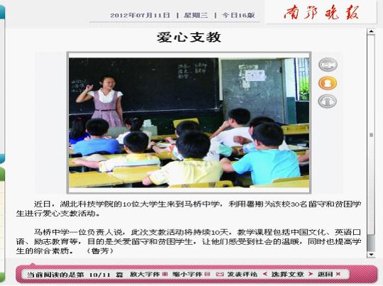 db真人体育官网自09年来,携手马桥中学举办的众多活动让一些来自贫困家庭的孩子感受到了社会的关爱。时至今日,同学们依然坚守着这样一份责任,为马桥中学的孩子们带去一点又一点的希望之光。这次支教活动也引起了咸宁媒体的广泛关注。南鄂晚报、咸宁日报、咸宁电视台等媒体都对此次活动做了相关报道。同学们不仅感受到了自己付出的微薄力量,还看到了整个社会对希望的坚守,对爱心的关注。