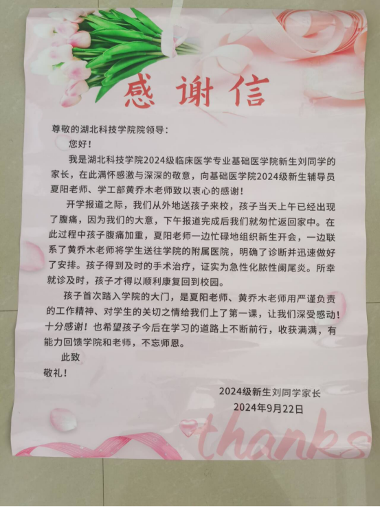 (通讯员:洪莹莹,审核:佘同辉)金秋九月,丹桂飘香。在此收获的季节里,DB视讯迎来了又一批怀揣梦想与希望的青年学子。近日,公司db真人体育官网收到了一封来自2024级新生家长饱含深情的感谢信。