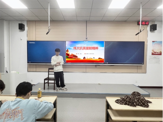 活动由各班团支书主持,通过PPT和视频,生动地再现了抗美援朝的历史背景、战役过程和英雄事迹。同学们认真的目光在一幅幅历史画卷前驻足,仿佛去到了当年那枪林弹雨的战场,感受到了志愿军战士们英勇无畏精神与责无旁贷的担当,更加深刻地理解了和平的来之不易,以及维护国家主权和领土完整的重大意义,深入了解那段波澜壮阔的历史,深刻地理解抗美援朝精神是中华人民在艰难困苦中锻造的宝贵精神财富,是激励全体中国人民不断前进的强大动力。班会期间班主任通过提问互动等方式,让同学们更加深入地了解抗美援朝的历史知识,更加深刻地理解了那段历史的艰辛与伟大。