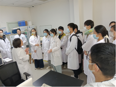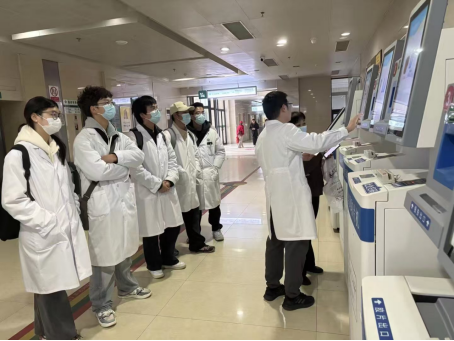 在附属医院的精心统筹下,身着白大褂的同学们以10人小组为单位,分批次深入门诊、急诊、内外科病房、检验中心等核心区域,开展沉浸式学习。步入门诊大厅,带教老师首先介绍分诊台与收费窗口的核心功能,细致讲解自助缴费设备操作及公众号预约挂号流程;在药房区域,老师重点说明取药流程与药品管理规范,让同学们对诊疗前端环节有了系统认知。随后,内科带教老师带领对应小组进入内科诊室,结合实时接诊场景,生动解读问诊沟通技巧、病历书写规范等日常制度;外科带教老师则引导员工观摩外科门诊,从病史询问到体征检查,完整呈现临床诊疗的严谨流程。