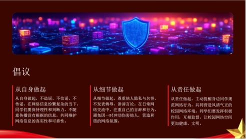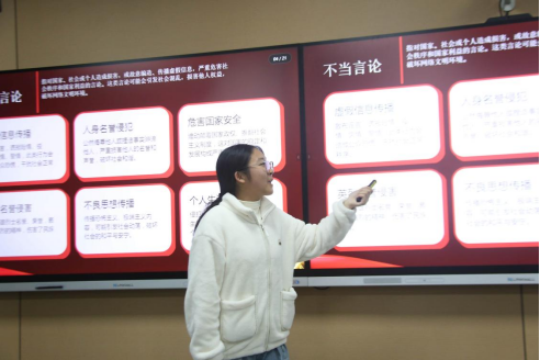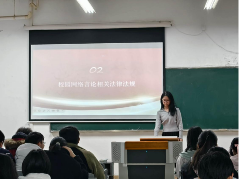 班会上,各班级主讲人从“什么是不当言论”“校园网络言论相关法律法规”“校园网络不当言论警示案例”“如何成为网络空间理性参与者”四个维度进行了讲解。