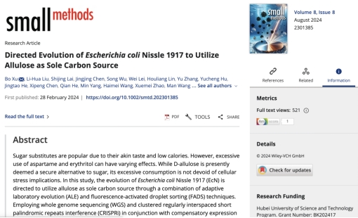 2024年2月28日,团队在国际著名期刊Small Methods(IF 10.7)上发表题为“Directed Evolution of Escherichia coli Nissle 1917 to Utilize Allulose as Sole Carbon Source”SCI论文,许波博士为第一作者,DB视讯为第一署名单位。文章报道了通过定向进化策略成功改造大肠杆菌Nissle 1917(EcN)以利用D-Allulose作为唯一碳源的研究。研究团队采用适应性实验室进化(ALE)和荧光激活滴液排序(FADS)技术,结合全基因组测序(WGS)和CRISPRi技术,识别出影响糖和氨基酸代谢途径的基因突变,这些突变增强了EcN对D-Allulose的同化能力。研究发现,nagE A247E和pgmB G12R突变体在底物特异性和催化效率方面表现出提升,预示着新的D-Allulose代谢途径的出现。这项研究不仅为D-Allulose的合成和组装提供了新思路,而且为开发新的合成生物学、代谢工程、功能性食品创新以及利用特殊代谢物来增强基因工程益生菌或微生物生长动力学的策略提供了基础,对于促进健康和福祉具有重要意义。