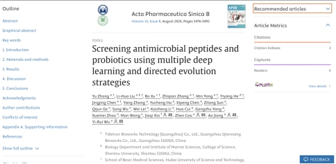 2024年5月10日,团队在国际著名期刊Acta Pharmaceutica Sinica B(中科院一区TOP期刊,IF 14.5)上发表题为“Screening antimicrobial peptides and probiotics using multiple deep learning and directed evolution strategies”SCI论文,文章提出一个基于深度学习的人工智能模型COMDEL,它能够以94.8%的准确率识别抗菌肽(AMPs),并用于筛选具有高AMP生产潜力的食用益生菌。通过结合高通量筛选技术和定向进化策略,研究团队成功提高了植物乳杆菌(Lactobacillus plantarum)的抗菌能力,并为工业规模生产AMPs铺平了道路。COMDEL模型的开发和优化为抗菌肽的识别、设计和应用提供了一个强大的工具,有助于推动在食品加工和医疗领域的应用。