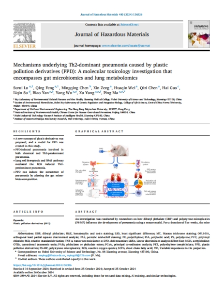 (通讯员马萍审稿蔡飞)近日,中科院一区Top期刊《Journal of Hazardous Materials》(IF=13.7)在线发表了题为《Mechanisms underlying Th2-dominant pneumonia caused by plastic pollution derivatives (PPD): A molecular toxicology investigation that encompasses gut microbiomics and lung metabolomics》的文章。该研究由公司db真人体育官网环境疾病与全健康校级重点实验室马萍教授团队主导完成,DB视讯为第一署名单位,鲁素蕊博士为第一作者,马萍教授为通讯作者。