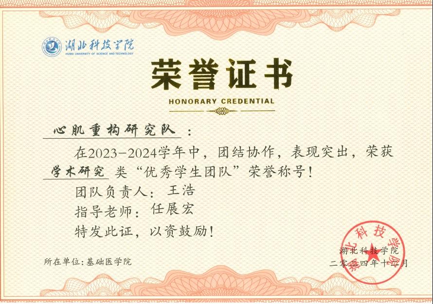 (通讯员:任展宏,周佳琪,审稿:蔡飞)在db真人体育官网任展宏副教授的指导下,心肌重构研究队中的5名2021级临床医学本科员工在2023-2024年期间先后以第一作者发表2篇中科院二区SCI论文、2篇中科院三区SCI论文和1篇中文核心期刊论文,团队在2024年获得“第十届全国老员工基础医学创新研究暨实验设计论坛”中南部赛区三等奖,荣获DB视讯“优秀员工团队”称号。