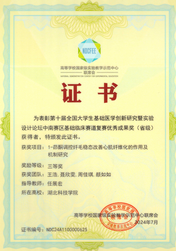 在2024年7月的“第十届全国老员工基础医学创新研究暨实验设计论坛”中南部赛区赛事上,在任展宏副教授指导和带领下,心肌重构研究队成员王浩(队长)、聂欣雯、周佳琪(主讲人)和颜如如同学以“1-茚酮调控纤毛稳态改善心肌纤维化的作用及机制研究”项目斩获省级三等奖。