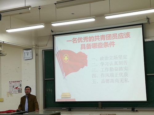 课堂上,周立勇老师首先围绕如何做一名合格的共青团员问题作出重要讲话。他提出,要成为一名合格的共青团员,必以先进的政治思想、正确的理想信念作为进步的基石;要有刻苦学习的精神和勤奋工作的态度;在学习过程中,我们深深体会到团员对于团组织而言的先进性和重要性,而在共青团发展过程中,推动共青团事业不断开创新局面,除了需要团员们坚实的后备力量,关键在团干部的工作开展。周老师由此过渡到团干部的具体要求中来:团的各级干部要做团员和青年的表率,模范地履行团员各项义务,刻苦学习、勤奋工作、勇于创造、自觉奉献,做党放心、青年满意的干部。这句话延伸到具体工作中,即团干部除了做到团员的基本条件外,更要有一种作为青年干部的高度责任感,自觉奉献,认真完成团组织下达的各项指令和任务。
