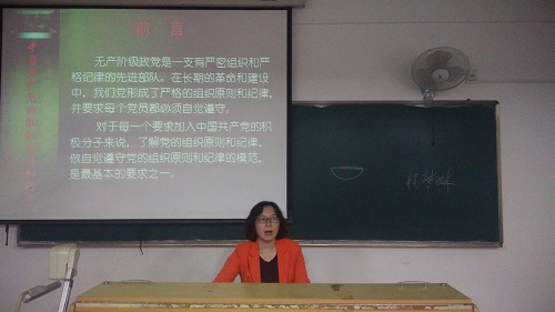 2017年5月8日晚上,db真人体育官网分党校入党积极分子在解剖楼教室参加“中国共产党的组织原则与纪律”培训课,此次培训邀请到db真人体育官网党总支书记程梦琳老师 。学员们通过学习党的组织原则与纪律,了解到党的组织原则与纪律, 能够“以身作则,严于律己,讲诚信、懂规矩、守纪律,襟怀坦白、言行一致,心存敬畏、手握戒尺”,使学员们从思想上对党的认知改变,从而对党忠诚老实,对群众忠诚老实,有利于发扬党的组织与纪律性,继承党的先进性与光荣性,为实现伟大的中国梦奋斗,争取做合格的建设者和可靠的接班人。