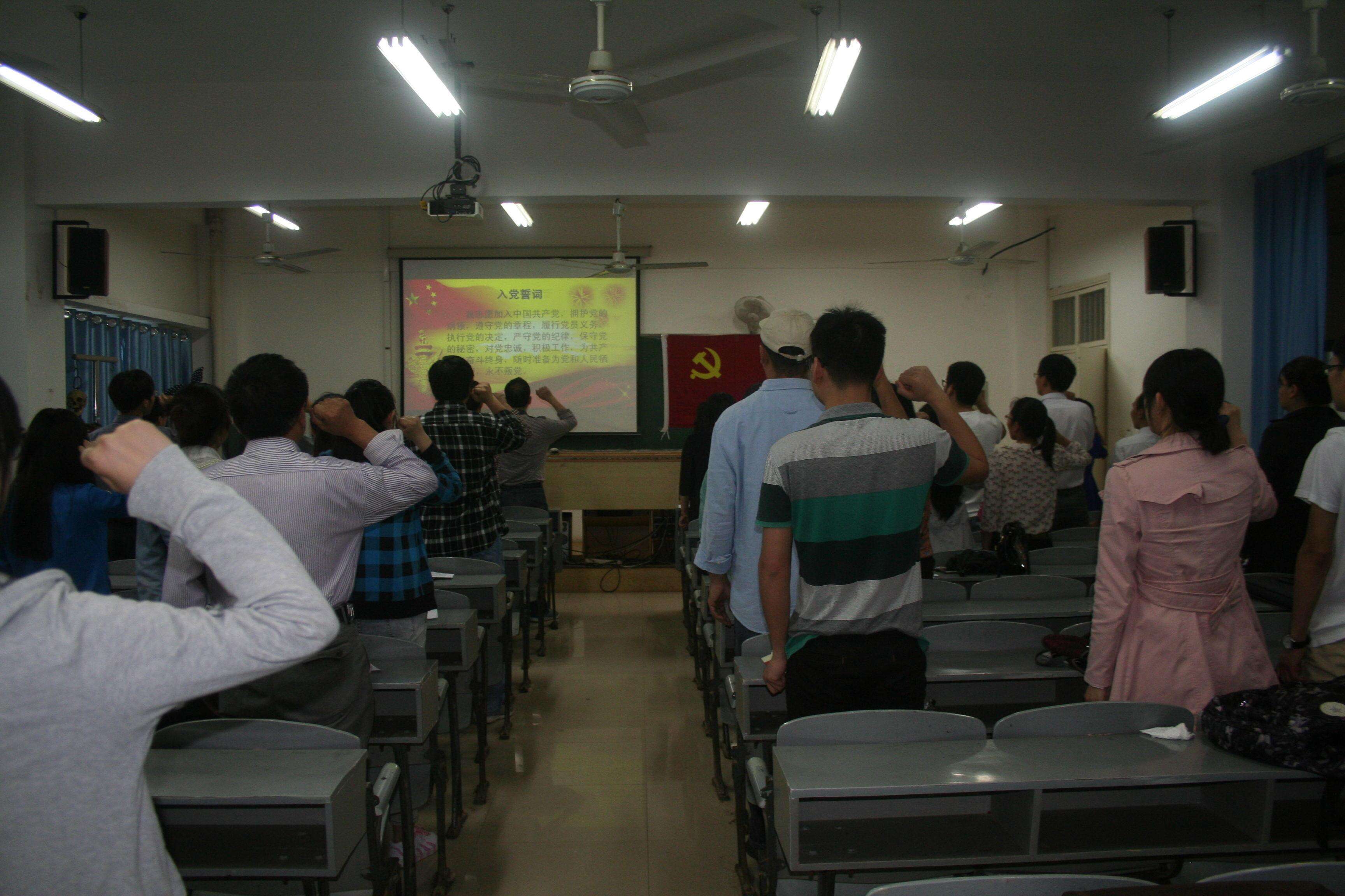 首先,党总支副书记李应续同志带领全体党员重温入党誓词。同志们胸前佩戴着党徽,站在鲜红的党旗下,庄严地举起右手,声音洪亮的宣读誓词,“我志愿加入中国共产党,永不叛党”。重温入党誓词,不忘初心,为党的事业再接再厉。接着,党总支书记程梦琳同志结合我们教育工作实际情况和各自岗位要求,带领同志们学习中国共产党章程,党员权利,党员义务。她说,基层党总支要充分发挥战斗堡垒作用,党员干部要充分发挥先锋作用,我们高校教师要以优秀党员的高标准严格要求自己,发挥言传身教的示范作用,争当为人师表和教书育人的楷模。党员要用合法的程序维护权利,要从正面发声,传递正能量,引导大众舆论。然后,党总支宣传委员石裹莹同志领读了习近平总书记关于中国梦、弘扬社会主义核心价值观、官德、文化交流等系列讲话的重要精神。