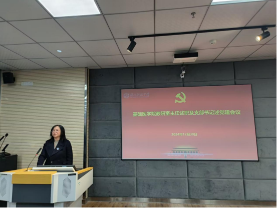 随后,形态学教工党支部书记马萍、机能学教工党支部书记朱海丽、病原学教工党支部书记朱薿、员工党支部书记夏阳依次进行了现场述职。各支部重点汇报了落实重点任务、党建业务融合等日常工作情况,全面总结党支部一年来在推动理论学习、思想教育、业务提升等方面所取得的工作成效。同时,深入分析了支部党建工作存在的问题和不足之处,并提出支部下一年度的工作思路和解决问题的对策。