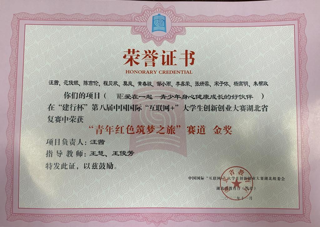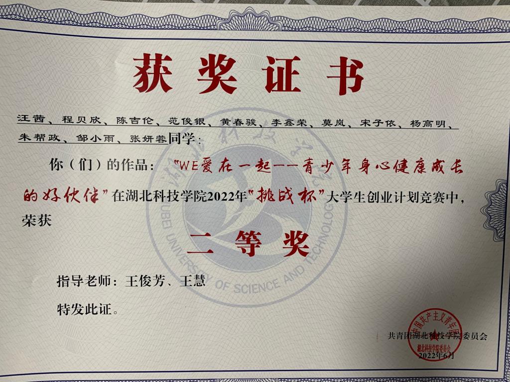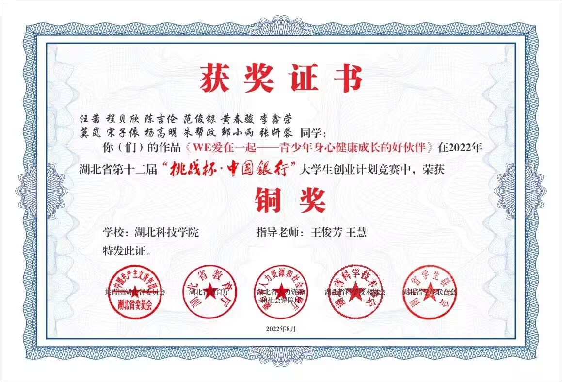 (通讯员:蔡子璇)在2022年,DB视讯“WE爱在一起”项目组获得了颇多的奖项,其中:由指导老师王俊芳、王慧和“WE爱在一起”项目组成员汪茜、程贝欣、陈吉伦、范俊银、黄春骏、李鑫荣、莫岚、宋子依、杨高明、朱帮政、邹小雨、张妍蓉,共同创作的作品《WE爱在一起——青少年身心健康成长的好伙伴》在DB视讯2022年“挑战杯”老员工创业计划竞赛中荣获二等奖、在湖北省第十二届“挑战杯·中国银行”老员工创业计划竞赛中荣获铜奖、在“建行杯”第八届中国国际“互联网+”老员工创新创业大赛湖北省复赛中荣获“青年红色筑梦之旅”赛道金奖。