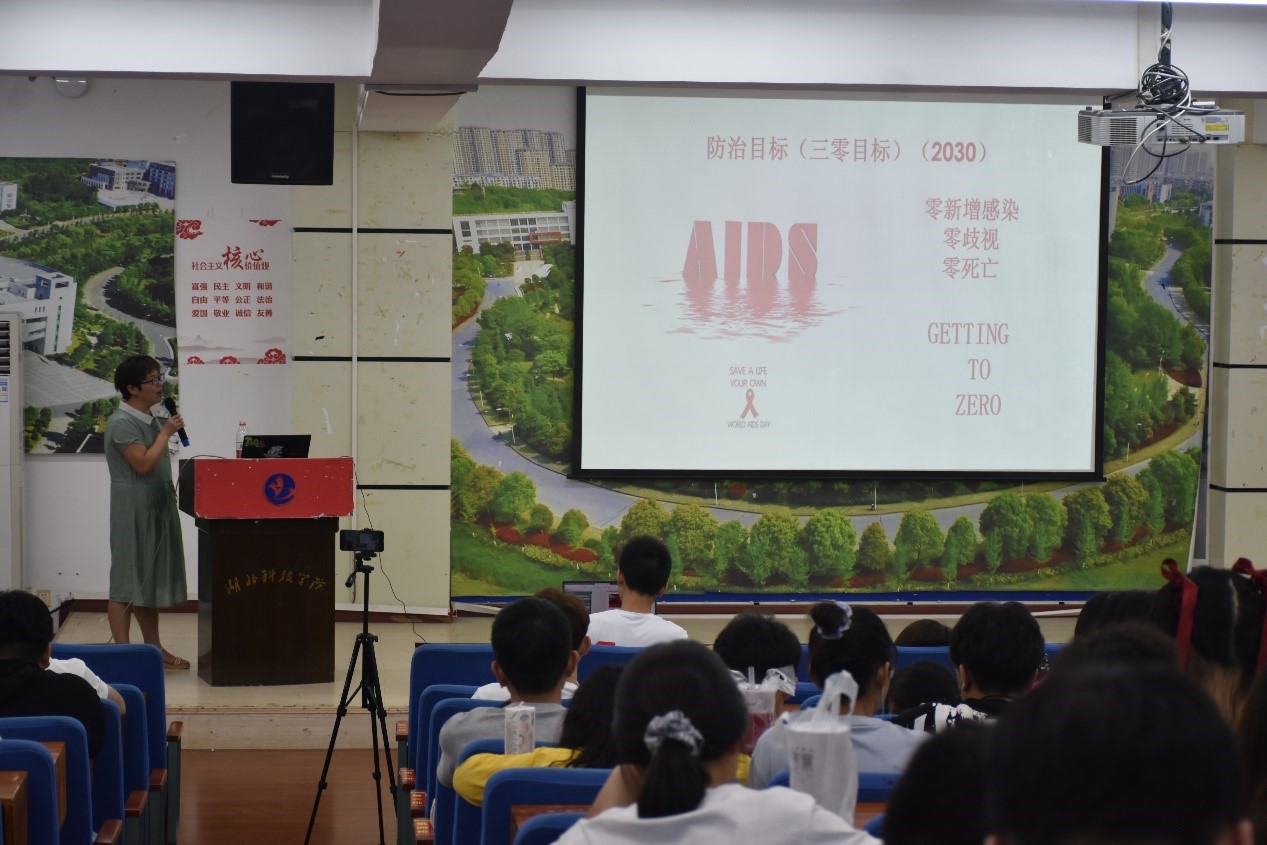 活动一开始,主持人组织同学们齐唱校歌,帮助大家更快的适应到揽月大讲堂的气氛中。随后王俊芳老师从艾滋病的基本知识,历史起源以及流行趋势开始讲解。并且谈到艾滋病如今已经是全球重大公共卫生问题以及社会问题的严峻形势,如果不去普及防艾知识与预防措施,将会造成非常严重的后果,因此,王俊芳博士从艾滋病的传播途径,检测手段等方面来告诉同学们如何去预防与检测艾滋病。最后王俊芳老师提及我国如今的艾滋病防治目标以及四免一关怀的政策,强调了中国要争取2030年之前达到“零新增目标,零感染,零死亡”的效果。