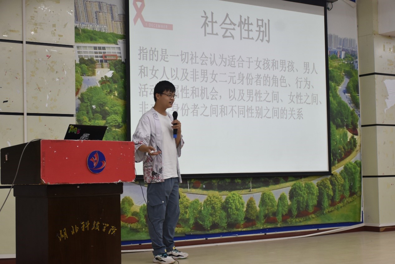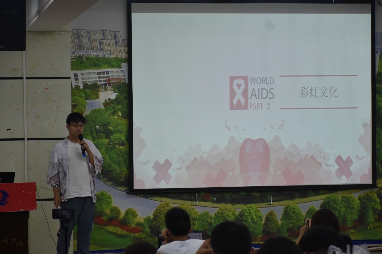 除了艾滋病相关知识外,王俊芳老师的随行志愿者们也给同学们带来了其他拓展内容。志愿者蔡庚为同学们介绍“彩虹文化”,以“当你看到男生或者女生的时候你会想到什么?”为开头让同学们进行发散思考,在思考中,志愿者蔡庚为大家讲解了关于男女的刻板印象、社会性别及其心理性别,并且引出性少数人群的知识以及彩虹文化的内涵,告诉同学不必戴着有色眼镜去看待性少数人群并局限于社会的种种刻板印象当中,性别是多元的,喜欢的方式也不止一种。