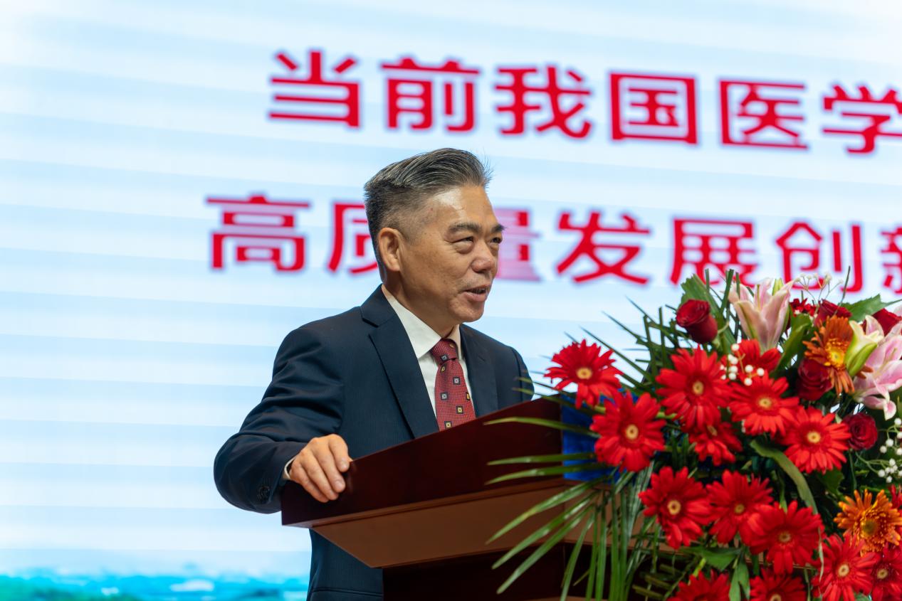 主题报告环节中,唐其柱教授以《当前我国医公司校高质量发展创新路径》为题,从大学和医科大学的形成与发展、我国高等教育的属性、体制和特色,以及医学学科高质量发展创新路径三个维度展开深入阐述。他结合自身丰富的高校管理经验与行业洞察,系统梳理了医学教育的发展脉络,剖析了当前医公司校发展面临的机遇与挑战,并为咸宁医公司的高质量发展提出了极具针对性的建议,引发在场师生的深刻思考。镇学初教授则以《新药研发:殊途同归之路》作主题报告,围绕科技工作“四个面向”——面向科技前沿、面向经济主战场、面向国家重大需求、面向人民健康,系统阐述了新药研发的时代使命。他重点分析了药物/治疗技术研发突破前夜的行业态势,解读了新一轮颠覆性科技浪潮带来的发展机遇,并聚焦合成生物学的机遇与挑战、人工智能(AI)对药物研发范式的改变等前沿话题,分享了自己的研究成果与独到见解,为在场从事医学科研的师生提供了全新思路。两位教授的报告内容兼具学术深度与应用价值,为在场师生带来了一场高水平的学术盛宴。